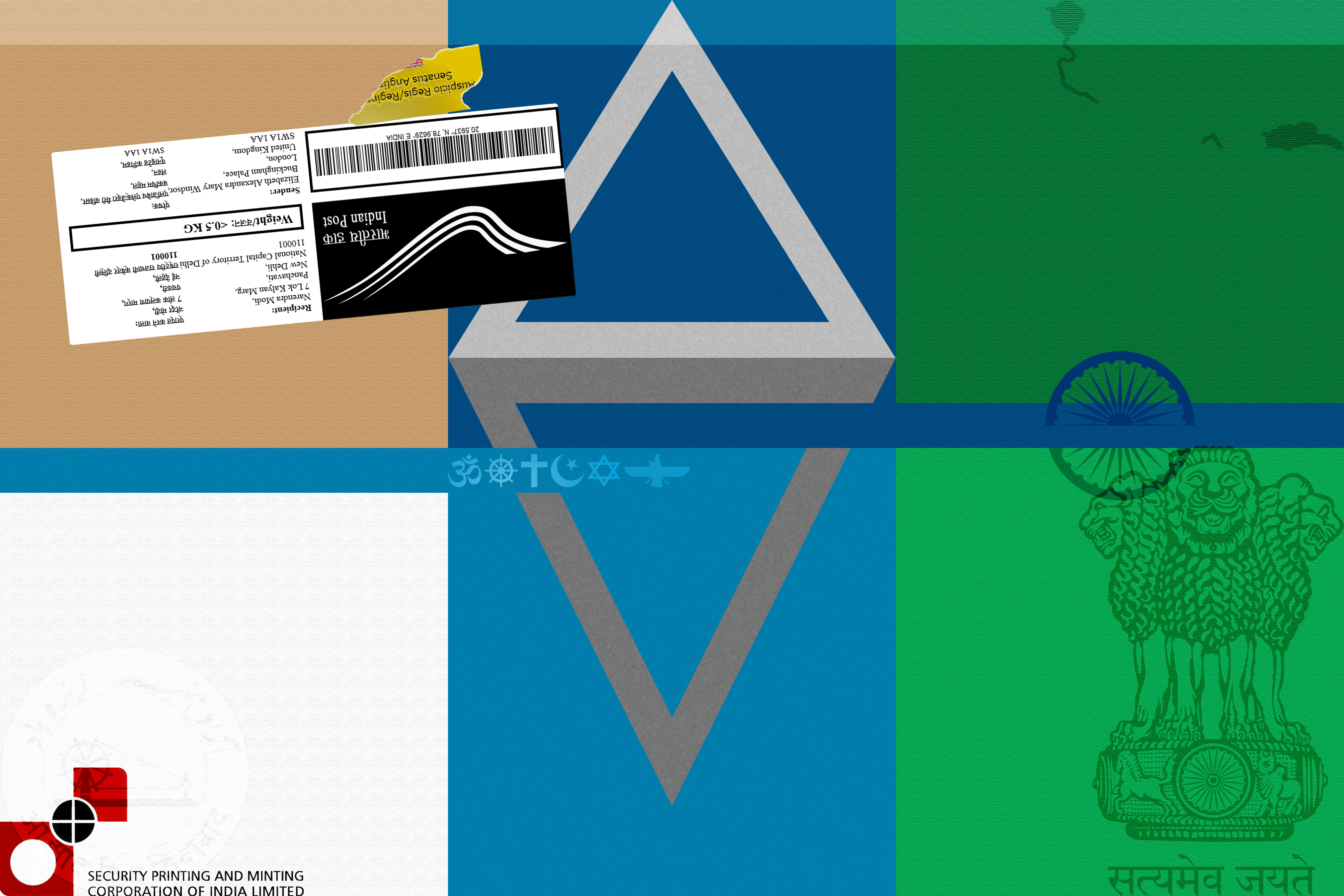 1. India is a huge nation with 28 internal administrative divisions; therefore, I modelled this flag around its physical geography, as opposed to its political geography. The six sections represent the six zones into which the nation is divided. Their respective colours are based on the climate or terrain most prominent within them. 2. The two grey triangles in the centre of the flag represent the cold Himalayas to the north, with the bottom triangle representing the intersecting Western Ghats, Eastern Ghats, and the Vindhya Range. 3. The horizontally thin blue regions that cross the flag represent the River Ganges, which spans the nation. The ‘Ashoka Chakra’ makes an appearance here, half submerged in the river, to represent the rich Indian textile industry, which is supported by industrialised techniques that depend on natural sources of perpetual motion. 4. The six most prominent religions in India are also represented here, as its constitution prides itself on ensuring equal rights for all citizens, regardless of their religion. 5. I really enjoyed the aesthetic of the Indian Head of State logo; it was plastered across most Indian websites I visited as well, which led me to believe it is popular symbolism. 6. The top right of the flag features the disputed territory and border disputes India is currently facing. 7. The bottom left of the flag features a sticker of the Security Printing and Minting Corporation of India Ltd., which is responsible for the printing of the Indian Rupee. 8. The top left of the flag includes a custom India Post packing label, as well as the torn signature British East India Company sticker.