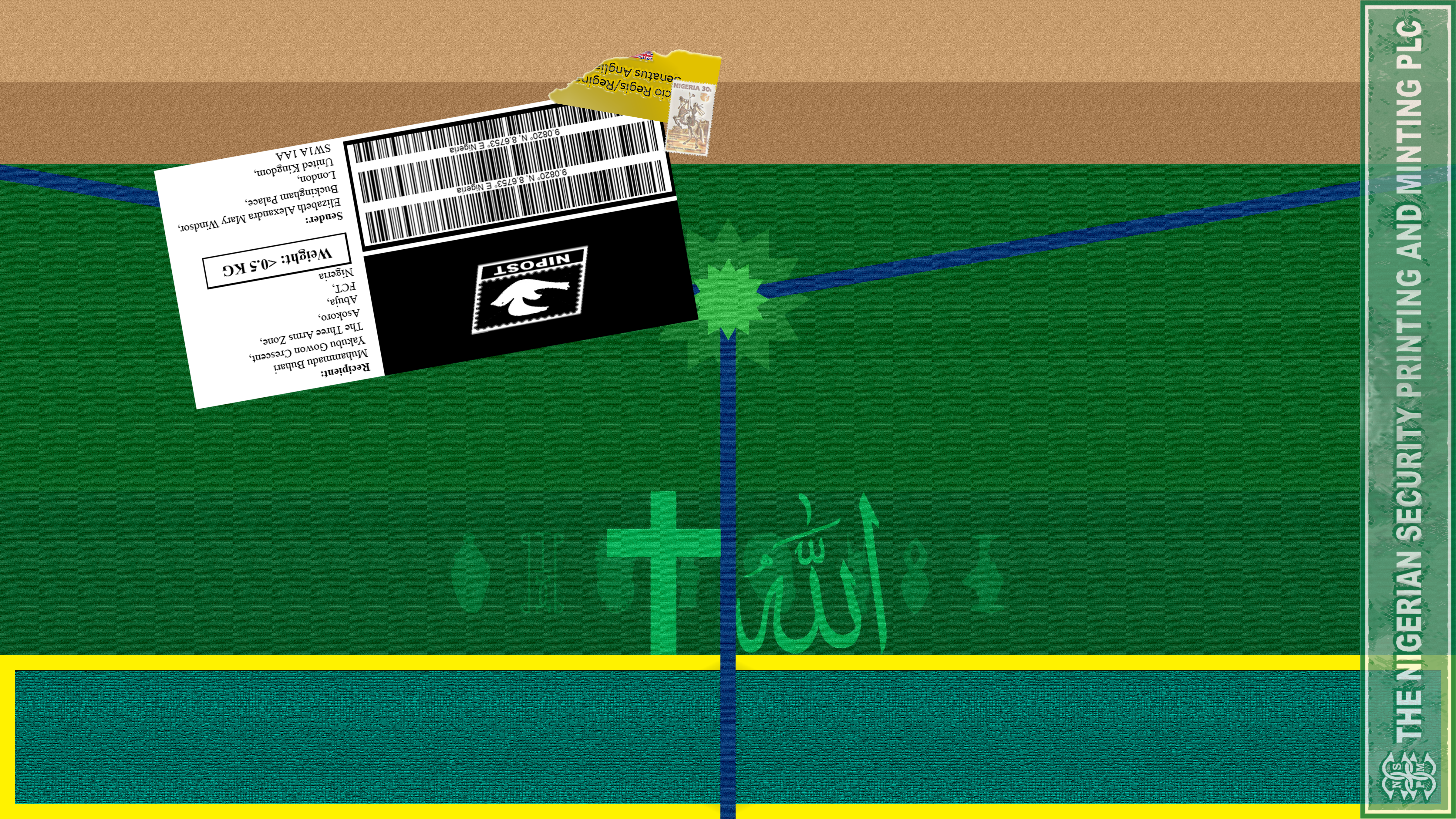 1. The five horizontal blue, green, and beige sections represent the various climates within Nigeria in relation to their geographical adjacency to each other. 2. The bottom teal section has a gold border to portray how this is the most population dense, as well as the most profitable region within the nation. 3. To the right is a banner of the Nigerian Security Printing and Minting Company Limited Plc, large in size to represent how Nigeria has the largest and healthiest economy in all of Africa. 4. The centre of the flag contains a twelve-pointed star, representing the twelve main linguistic groups of Nigeria. This star is intersected by three blue lines, which represent the intersecting Niger and Benue rivers. 5. Above the bottom teal section are the symbols of Christianity and Islam, overlaying artefacts of the eight major indigenous religions found within Nigeria prior to the arrival of Christianity and Islam. 6. Overlaying the flag as usual is a custom Nigeria Postal Service packing sticker with a torn BIEC sticker, overlaid by a Nigerian postal stamp from 1975.