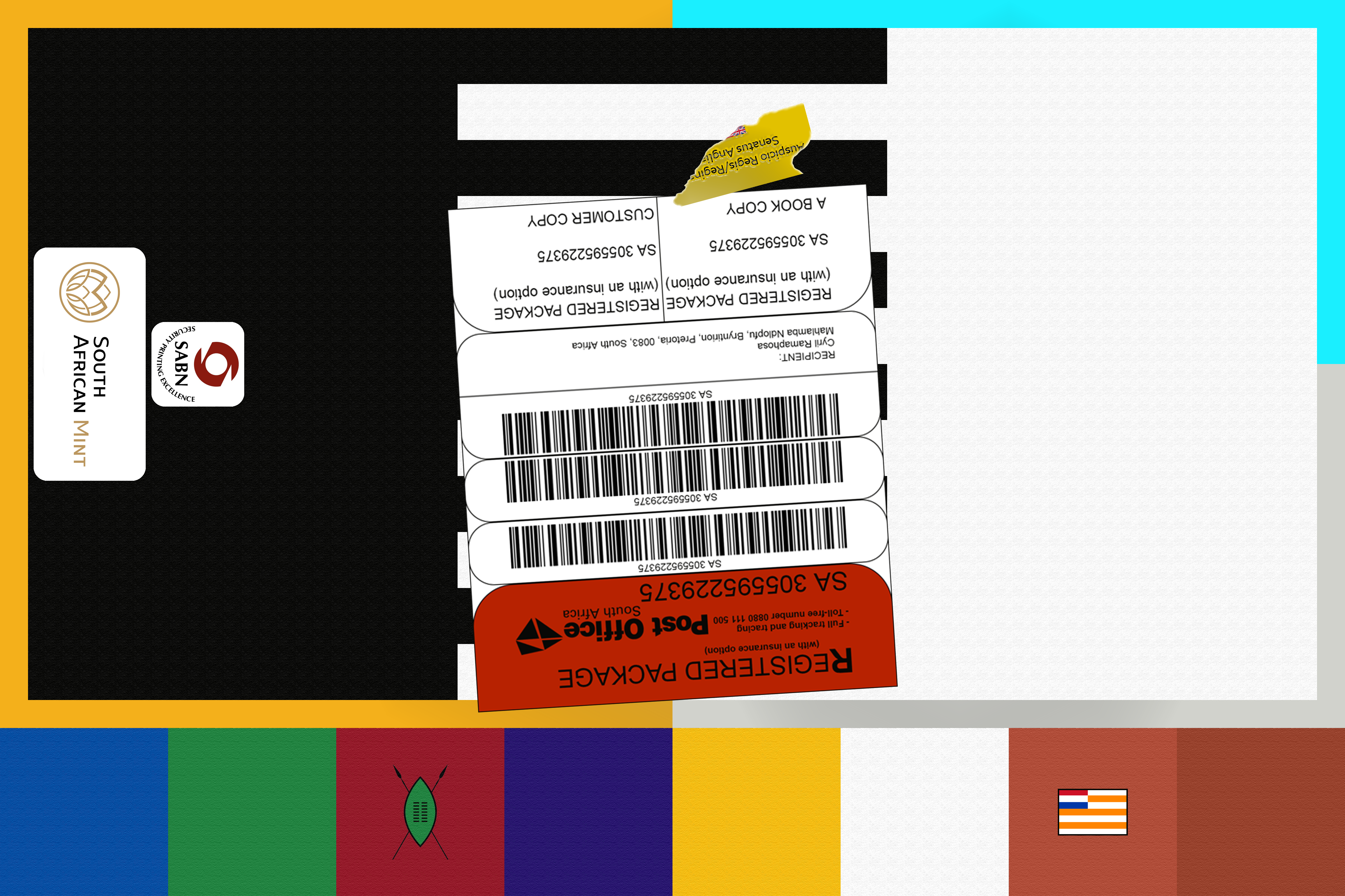 1. The coloured squares at the bottom (South Africa is the southernmost country in Africa) represent each state within South Africa, two of which include a significant symbol: the Zulu shield and the former flag of the Orange Free State. 2. The gold, silver, and light blue borders represent the rich platinum, gold, and diamond deposits within the nation. 3. The central region of the flag represents the unification of the ‘black, white, and coloured' people groups who reside within the nation. 4. The left side of the flag includes stickers representing the organisations responsible for the manufacture of the South African Rand. 5. The packing label is an emulation of the only clear example of a South African packing label I could find on Google. 6. The flag also includes the signature and torn British East India Company label.